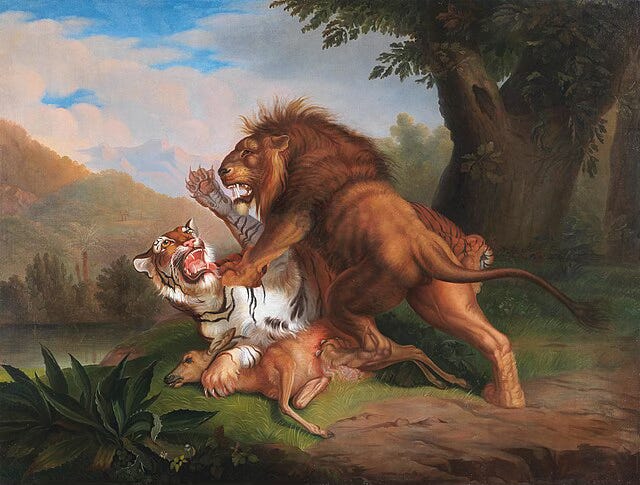 Tiger and Lion fight over a Fawn. Johann Wenzel Peter. (1745-1829) Paining. 1809.